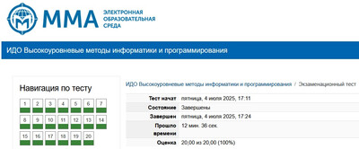 | Ответы на тест из курса ММА: Высокоуровневые методы информатики и программирования. Всего 20 вопросов. Результат сдачи: 100%.