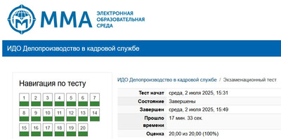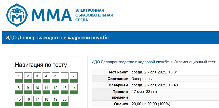 | Ответы на тест из курса ММА: Делопроизводство в кадровой службе. Всего 27 вопросов. Результат сдач: 100%.